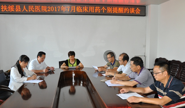 7月27日下午,扶绥县人民医院召开临床用药个别提醒约谈会,针对4个科室负责人进行廉政约谈。