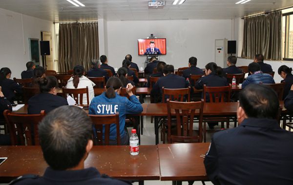 图为公安局组织干部、在押人员集中收看十九大开幕会现场