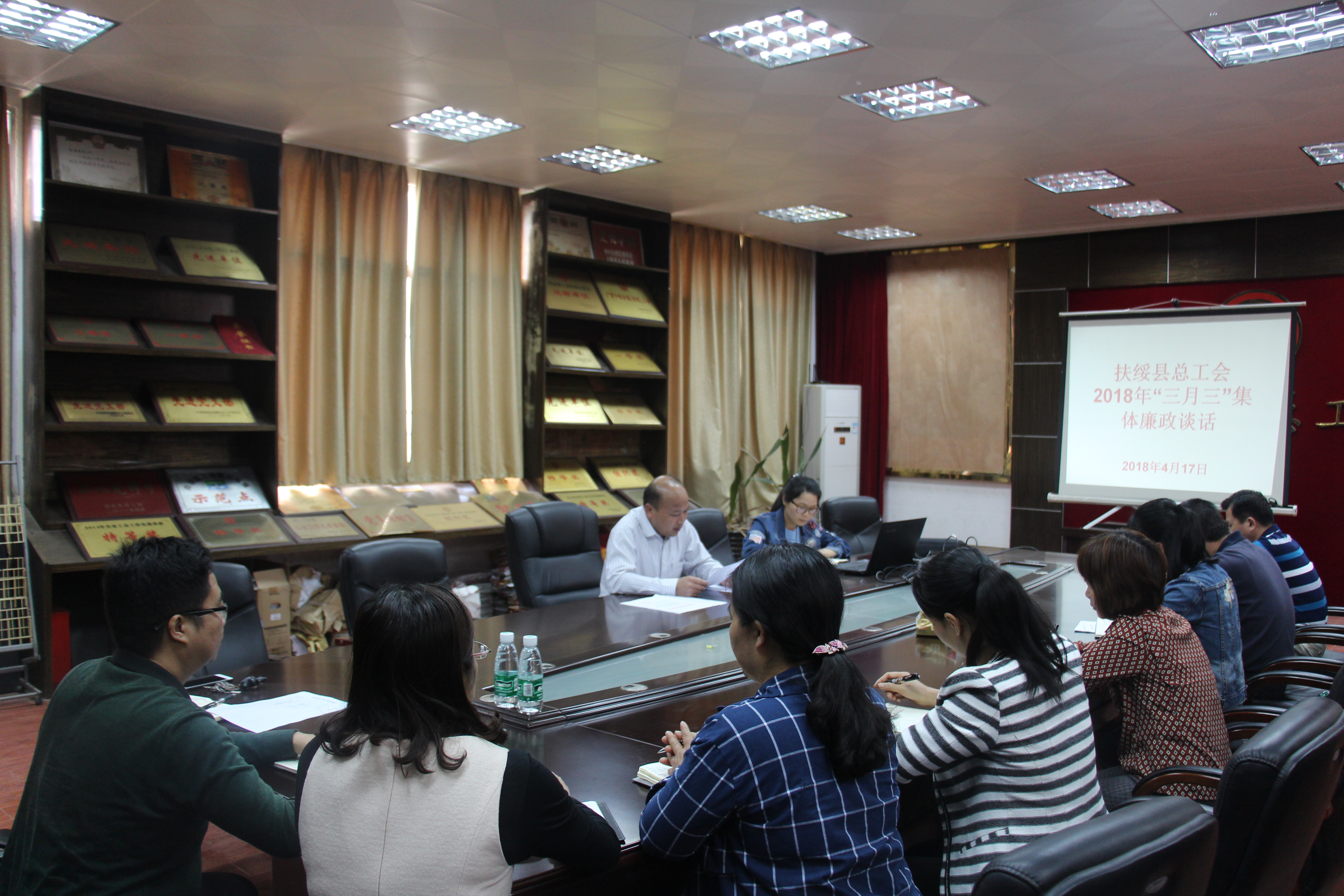 为进一步严明纪律,深化落实中央八项规定精神,认真履行党风廉政建设主体责任,坚决防止“四风”问题反弹回潮,4月17日,扶绥县总工会开展壮族“三月三”节前集体廉政谈话,对单位10名干部职工进行了节前廉政集体谈话,做到了早预防、早提醒、早打廉政“疫苗”。