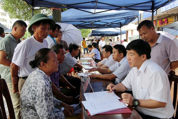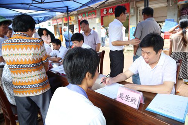 扶绥县委常委、纪委书记邓文杰(右一)在冒雨接访群众反映问题