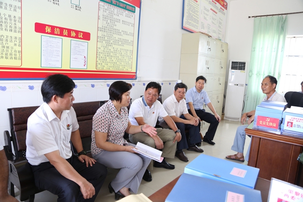 崇左市委常委、纪委书记梁日端(左二)在渠黎镇渠新村了解实行“阳光评议”制度落实情况。左三为扶绥县委书记黄云革