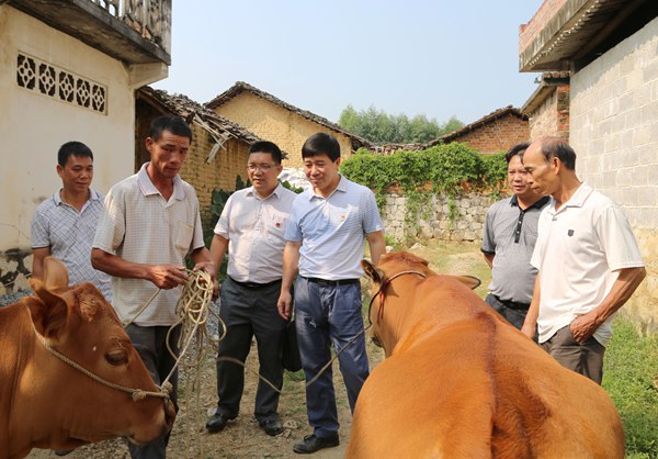 扶绥县委常委、纪委书记邓文杰(左四)率督查组与新宁镇上洞村民了解情况