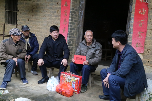 每到一处,邓文杰同志都与受走访慰问者一一握手,促膝交谈,关切地询问他们的身体状况和家庭生产、生活情况,鼓励他们树立信心,克服困难,在新的一年里取得新的佳绩,并祝愿他们度过一个祥和幸福的新春佳节。在新宁镇上洞村,邓书记亲切地对困难群众说:“在新春佳节即将来临之际,我代表扶绥县委给你们带来节日的问候和祝福,祝你们身体健康,阖家幸福,新春快乐!也希望你们鼓起勇气,战胜困难,勤劳致富。我相信,在党和政府的关怀下,在扶贫干部及村委的帮扶下,你们一定能够很快脱贫致富。”在场群众深受鼓舞,纷纷表示一定不辜负党和政府的殷切期望,依靠自己勤劳的双手,力争尽快脱贫致富。