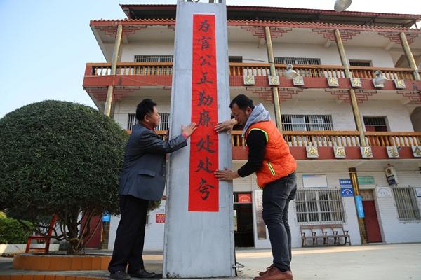 县纪委监察干部与新宁镇城厢社区村干一同贴上对联迎新春。
