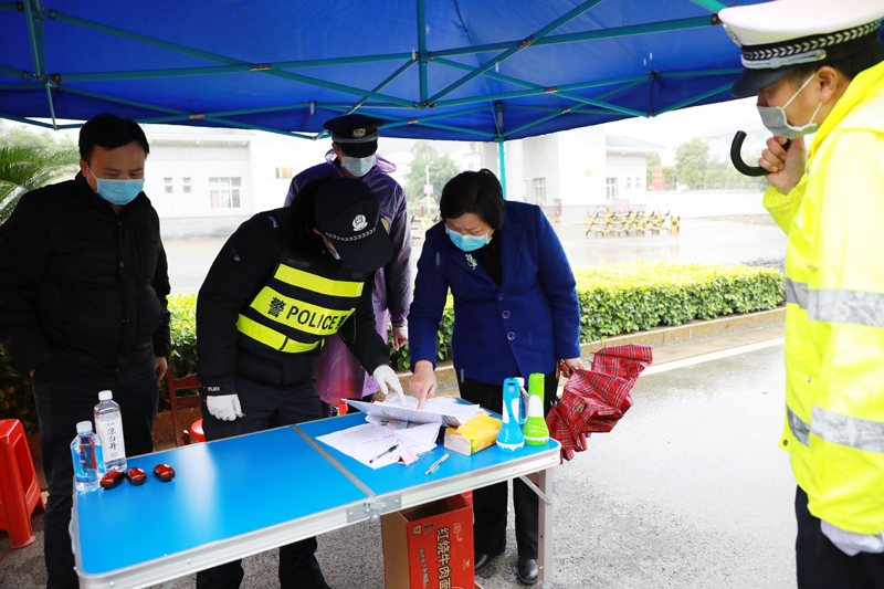 梁日端(左四)在南友高速扶绥收费站联合防疫检查点督导来往车辆登记工作
