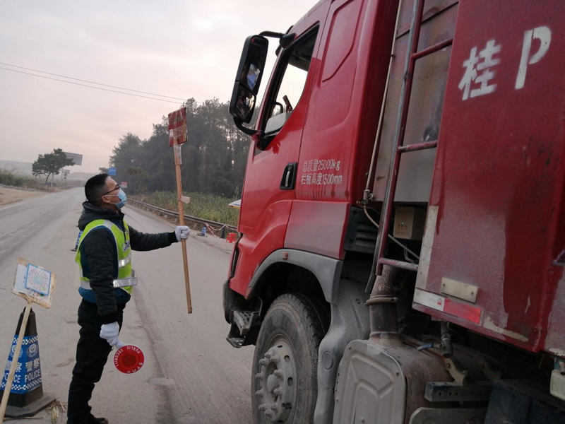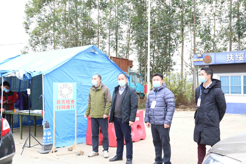 县委常委、纪委书记、监委主任韦福雄(左二)带队到中东镇公路卡点检查疫情防控措施落实情况。