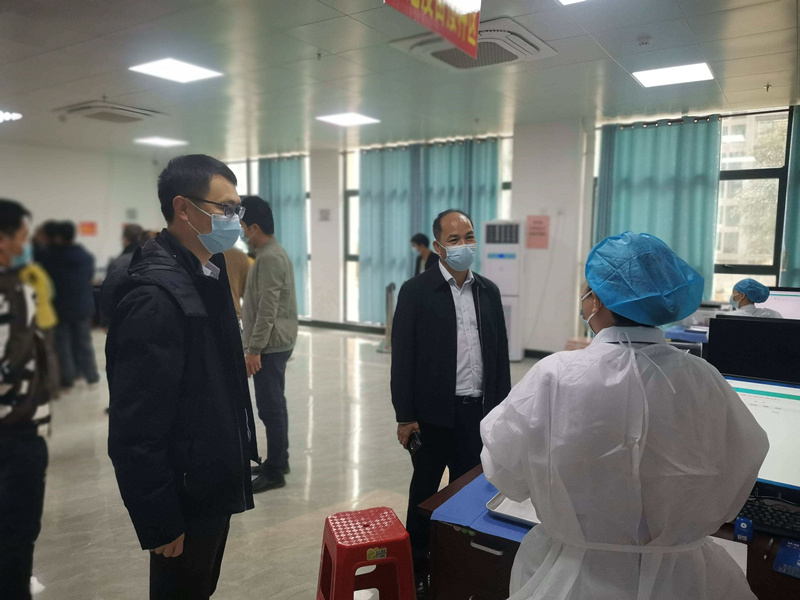县委常委、纪委书记、监委主任韦福雄(右二)带队到新宁镇卫生院疫苗接种点进行监督检查。