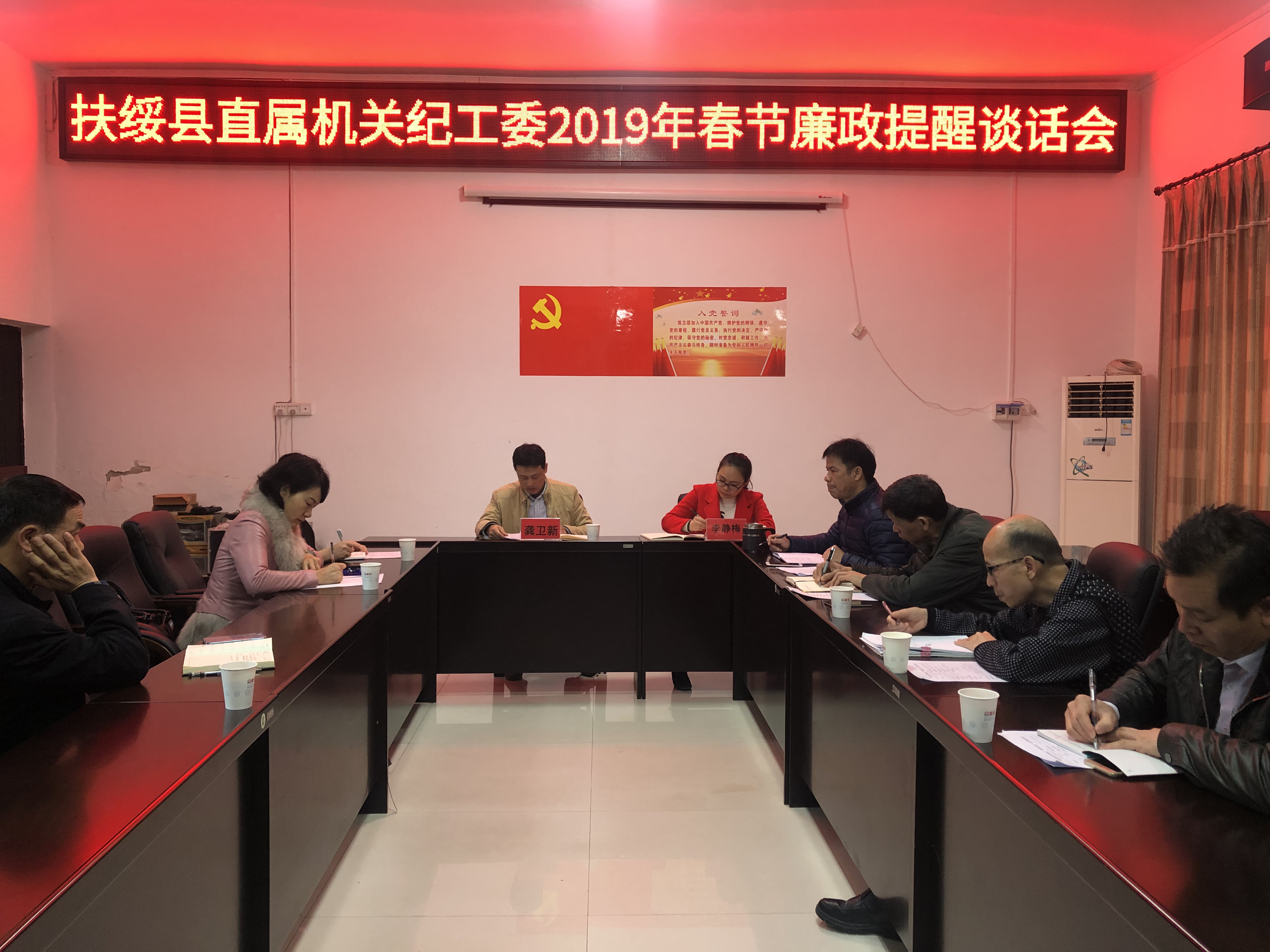 2月1日,县直属机关纪工委组织县直属机关工委、县委老干部局、县残联等3个综合监督单位开展2019年春节廉政提醒谈话,把好节前廉洁关。