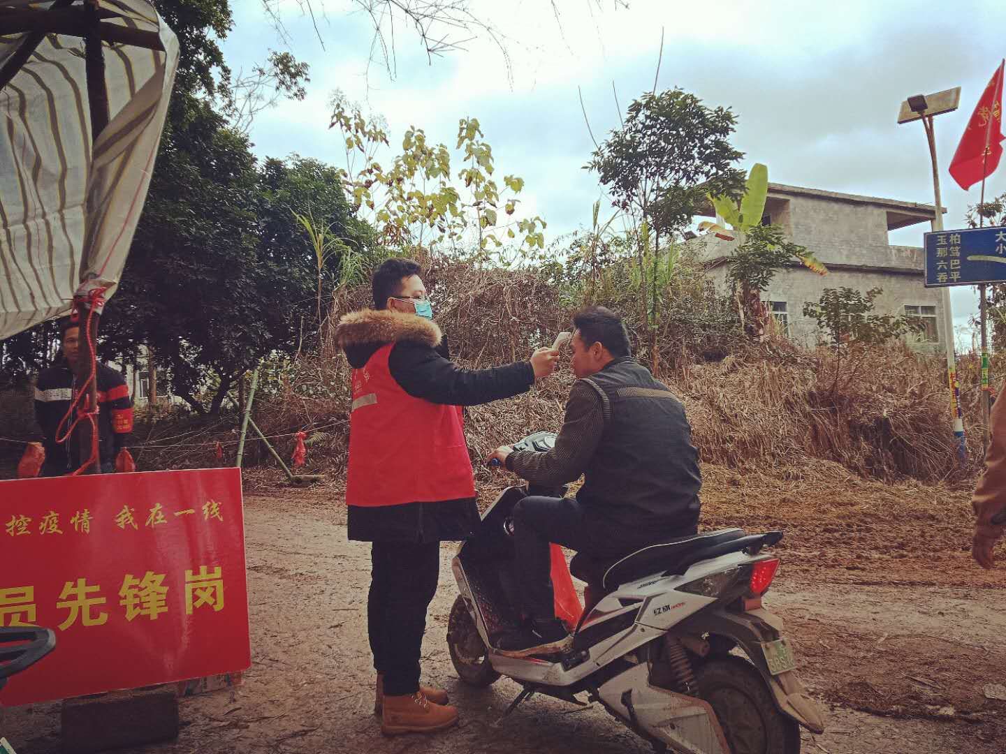 韦孟含在山圩镇玉柏村渠茤路口为进出村屯群众测量体温