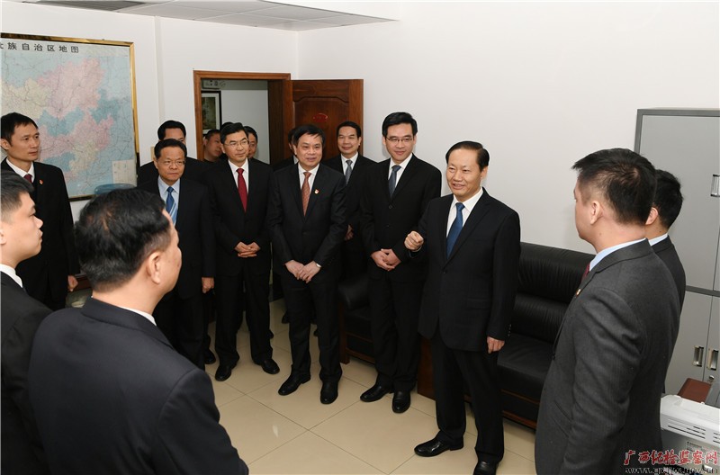 揭牌后,彭清华、陈武等来到自治区纪委监委机关,走进纪检监察三室、四室、十一室,亲切看望机关工作人员和转隶干部,详细了解执纪监督、审查调查等工作情况,希望自治区、市、县三级监察委员会依法忠诚履职尽责,继续做好干部培训、人员融合、工作磨合、调查措施全要素试用、“纪法”“法法”有机衔接和设置派驻纪检监察组等工作,强化纪法贯通,提升能力水平,规范权力运行,构建集中统一、权威高效的监察体系,把制度优势转化为治理效能,为推进全面从严治党,谱写新时代广西发展新篇章提供坚强保障。