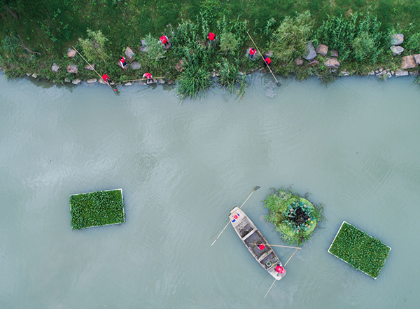在浙江省长兴县刘家渡河道南太湖段,河长带领专职保洁人员进行日常的乡村河道护理(2017年10月13日摄)。(新华社记者徐昱 摄)