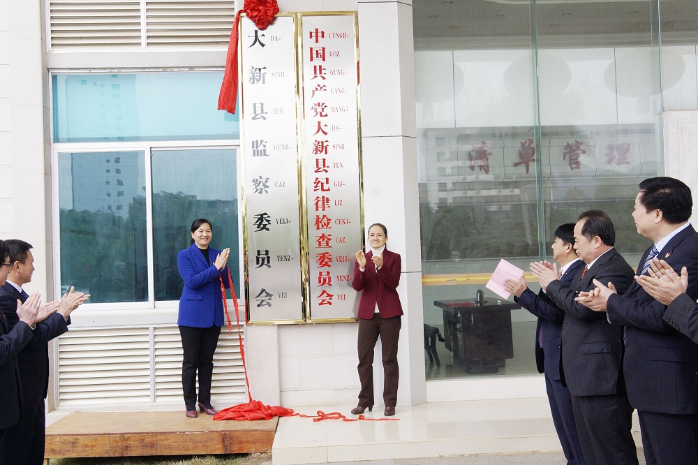 2月25日上午,广西壮族自治区崇左市委常委、大新县委书记赵丽和大新县委常委、纪委书记黄洪燕共同为监委揭牌。